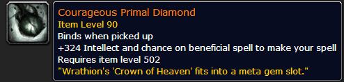 The meta gem is another thing to factor in when deciding where to put your haste. Acquiring it is an immediate boost to your mana, and most people are shaving off a bit of spirit to compensate. Adding haste is a VERY good option after getting the meta gem, since bumping haste is one surefire way to increase our effectiveness. It also has the added benefit of being able to squeeze more into the 4-second proc window (spells have to land within the 4 second window to be free).