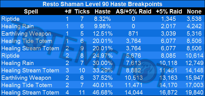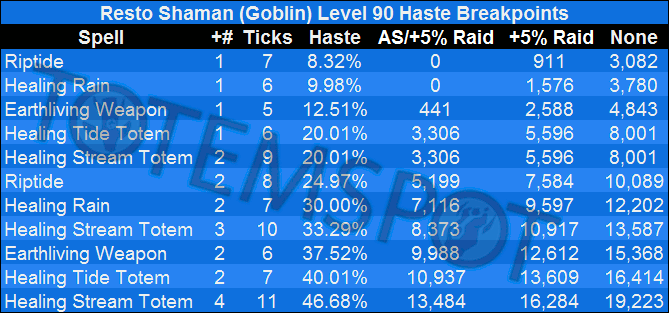 This is a huge issue, since getting that extra tick of HST/HTT is one of the main goals for us, as both of them make up massive amounts of our healing (especially with the T15 2-pc). So when analyzing the 20.01% breakpoint, keep this latency issue in mind, as well as how often (if ever) you swap to Ancestral Guidance. Depending on how much extra haste you need to ensure 100% ticks, and how often you don’t have HTT as a talent, the 20.01% BP could seem much less appealing.