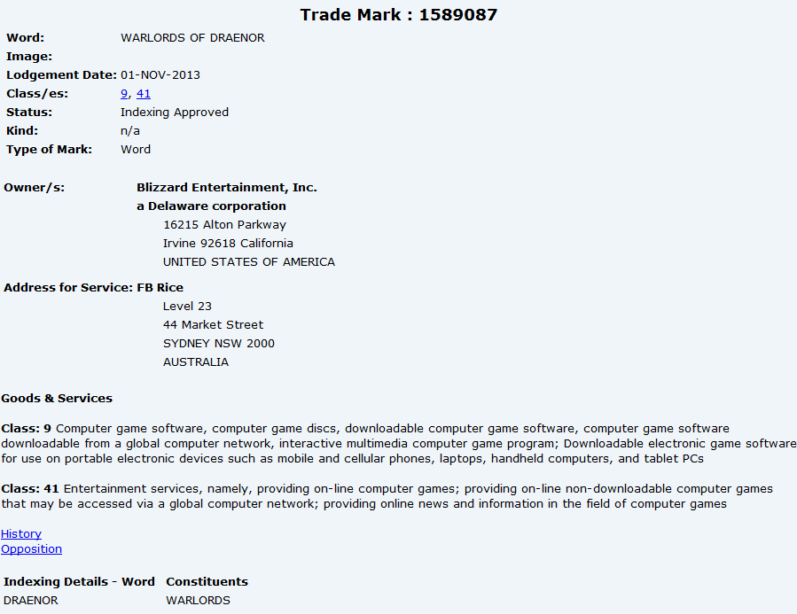 Additionally, MMO-Champion confirms that the “www.warlordsofdraenor.com” domain was registered to Blizzard Entertainment approximately a month ago. The New Zealand and Australian trademark websites do not allow for direct linking, so MMO-Champion has provided screenshots of the trademarks (click on the previews below for full images):