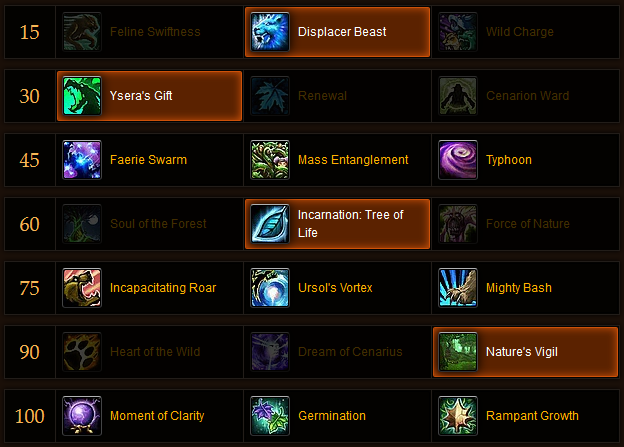 - Tier 90: With a significant nerf to Heart of the Wild, Nature’s Vigil becomes the clear choice for this talent tier. Heart of the Wild no longer provides a passive buff to your primary stat, but now gives you a six-minute cooldown that increases all your healing by 35% for 45 seconds. This means that Heart of the Wild is only useful for its utility and for extremely short fights where you can have high uptime on the 35% healing buff. For everything else, Nature’s Vigil provides the highest throughput.