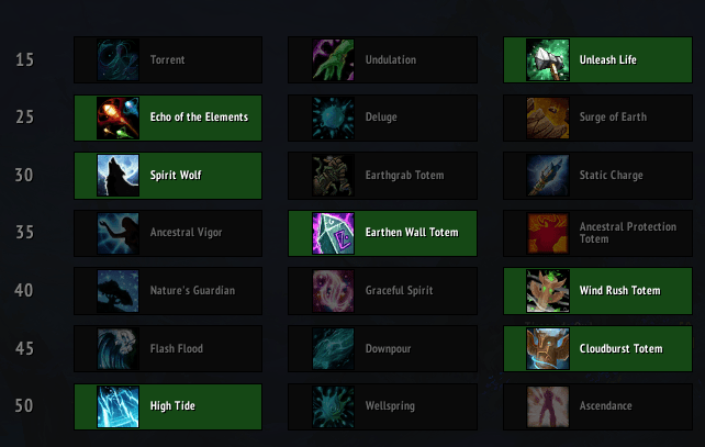 While there are a few talent changes, these currently all have very little impact. Both Torrent and High Tide saw 10% nerfs; however, due to Riptide’s significant buff to its initial heal, this nerf is not anything you would notice. As for High Tide, the main strength from this talent comes from its ability to prevent Chain Heal from reducing with each jump, and with the slight buff to Chain Heal‘s spell power scaling, this too is not very noticeable. It is worth noting that this nerf makes Ascendance and Wellspring a bit more of viable options. Last on the list is the addition of a new talent – Surge of Earth. Unfortunately, this is a fairly useless AoE healing ability, which cannot keep up with the other options in its row.