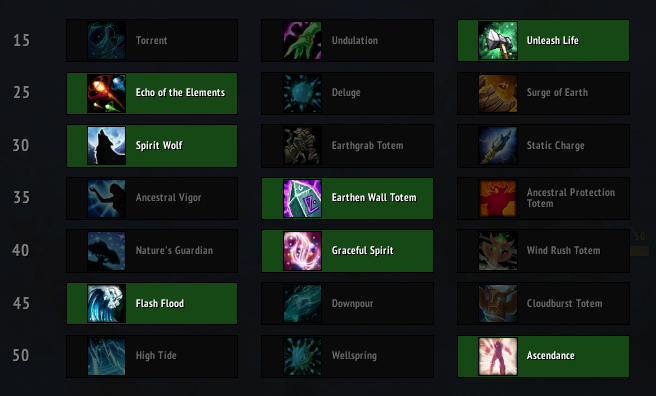 While there are a few talent changes, these currently all have very little impact. Both Torrent and High Tide saw 10% nerfs; however, due to Riptide’s significant buff to its initial heal, this nerf is not anything you would notice. As for High Tide, the main strength from this talent comes from its ability to prevent Chain Heal from reducing with each jump, and with the slight buff to Chain Heal‘s spell power scaling, this too is not very noticeable. It is worth noting that this nerf makes Ascendance and Wellspring a bit more of viable options. Last on the list is the addition of a new talent – Surge of Earth. Unfortunately, this is a fairly useless AoE healing ability, which cannot keep up with the other options in its row.
